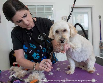 "Doodles & Whiskers is not anything like a large corporate place. It’s a family business, and our focus is to be more one-on-one with the dogs, cats, and the customers. It’s a quieter, calmer environment than one might find at many other groomers,” offers Raine, who has three dogs of her own, a standard poodle and a Chihuahua among them.